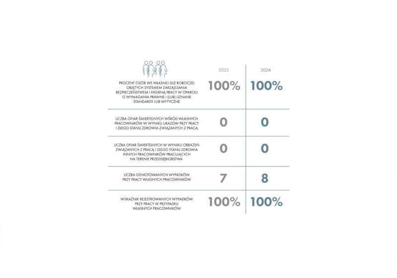 Wszyscy pracownicy Spółki zostali przeszkoleni w zakresie BHP. Szkolenia te obejmują 100% pracowników i odbywają się w pierwszym dniu pracy. W roku 2024 Spółka odnotowała 8 niegroźnych wypadków przy pracy. Żaden z nich nie spowodował trwałego uszczerbku na zdrowiu lub śmierci wśród pracowników. Wszystkie wypadki są rejestrowane i natychmiast wdrażane są odpowiednie procedury mające na celu zminimalizowanie ryzyka ich powtórzenia w przyszłości. Jako pracodawca szczególnie mocno zwracamy uwagę na kwestie bezpieczeństwa w pracy, dlatego oprócz obowiązkowych działań włączamy działania profilaktyczne i budujące świadomość pracowników. W 2024 r. Państwowy Inspektor Pracy docenił Dr Irena Eris za tworzenie bezpiecznego miejsca pracy Główną Nagrodą Państwowej Inspekcji Pracy im. Haliny Krahelskiej, która to nagroda przyznawana jest za wybitne osiągnięcia w zakresie prewencji zagrożeń zawodowych, nadzoru nad przestrzeganiem prawa pracy, wdrażania nowoczesnych i bezpiecznych technologii oraz popularyzacji ochrony zdrowia i bezpieczeństwa pracy. Wyróżnienie to podkreśla zaangażowanie w tworzenie przyjaznych i bezpiecznych warunków pracy oraz promowanie najlepszych praktyk w zarządzaniu.
