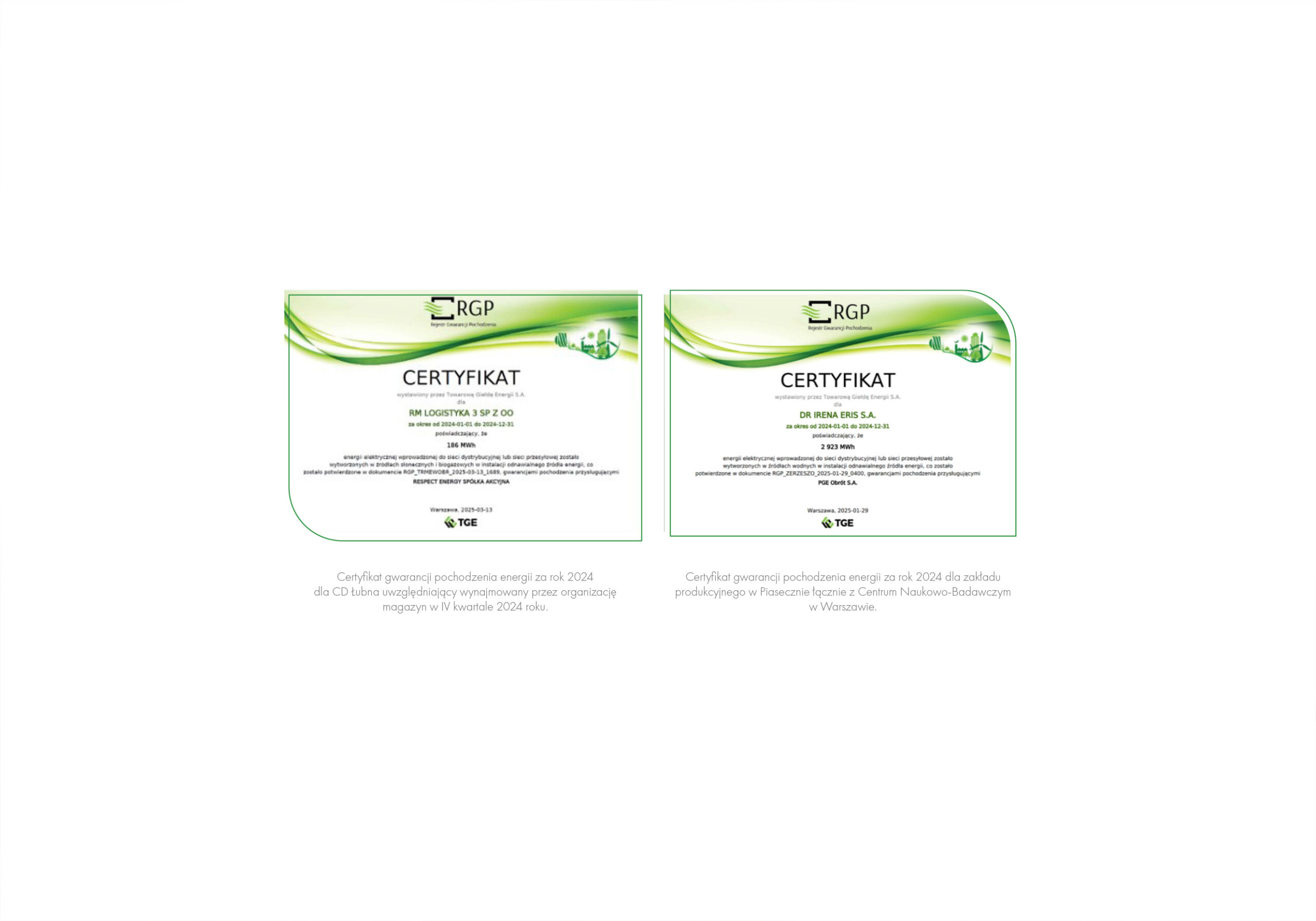 W ramach działań zmierzających do redukcji emisji dwutlenku węgla firma Dr Irena Eris S.A. konsekwentnie wdraża szereg inicjatyw mających na celu ograniczenie negatywnego wpływu działalności na klimat. Jednym z kluczowych elementów tej strategii jest korzystanie wyłącznie z energii elektrycznej pochodzącej ze źródeł odnawialnych, co firma realizuje nieprzerwanie od 2019 roku.