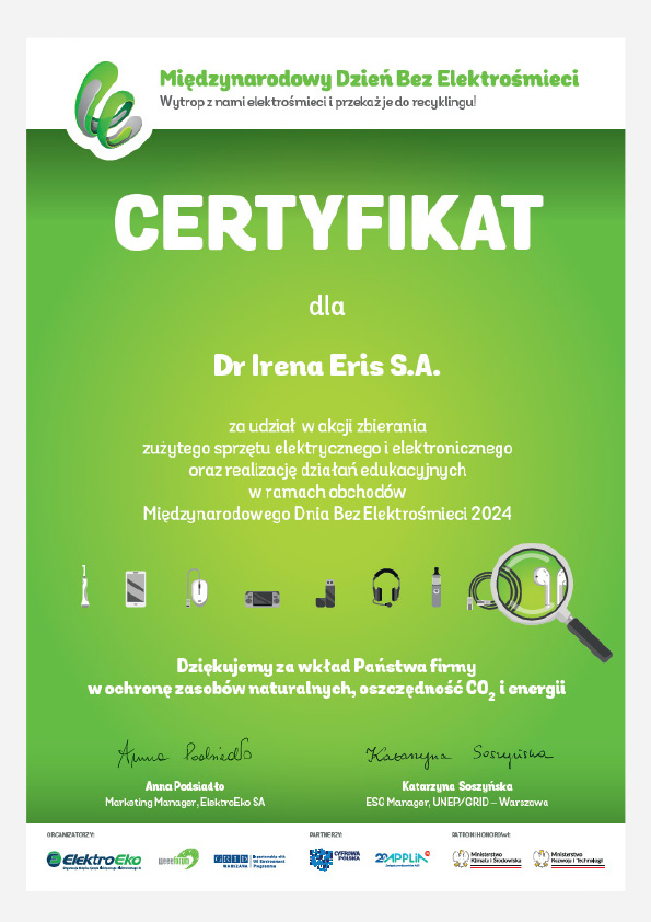 W związku z wprowadzaniem produktów w opakowaniach, firma Dr Irena Eris S.A. jest zobowiązana do osiągania wymaganych ustawowo poziomów recyklingu. Jako odpowiedzialna organizacja, we współpracy z Organizacją Odzysku Opakowań oraz Krajową Izbą Gospodarczą, konsekwentnie dążymy do realizacji celów wykraczających poza obowiązujące przepisy.