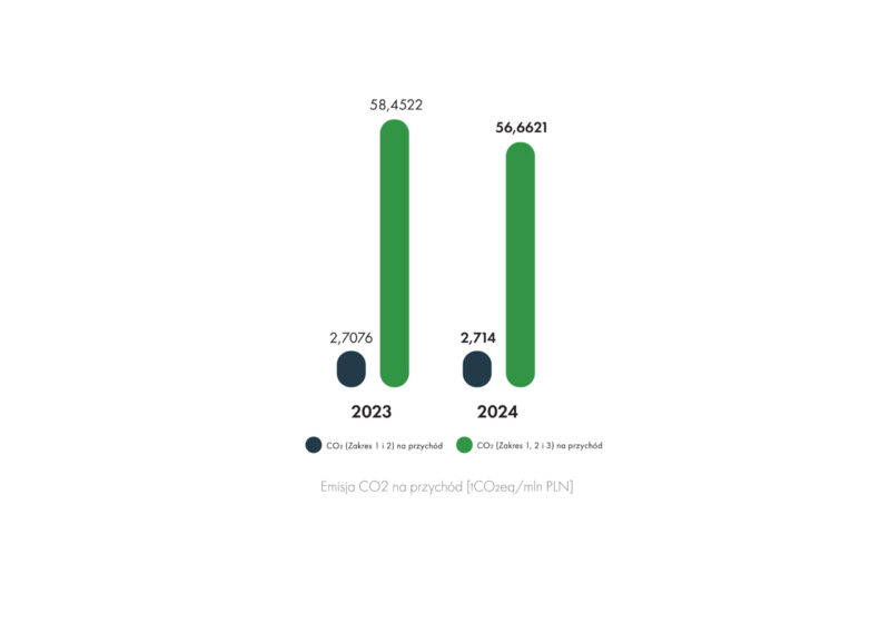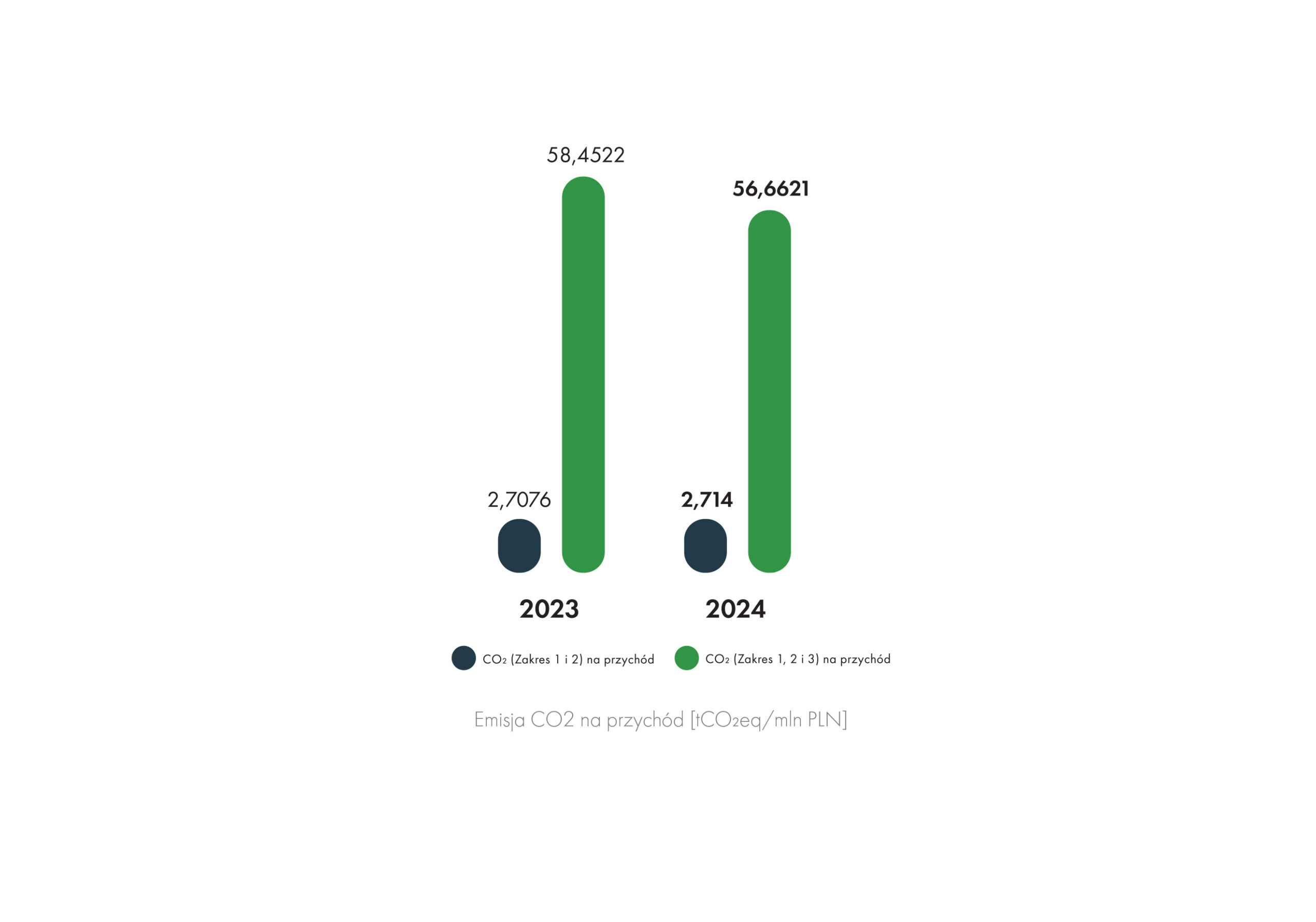 W latach 2023–2024 firma utrzymała intensywność emisji w zakresie 1 i 2 na stałym poziomie – 2,71 tCO₂eq / 1 mln PLN, mimo nieznacznego wzrostu emisji bezwzględnej. Jednocześnie widoczna jest poprawa efektywności środowiskowej w pełnym zakresie (1–3): całkowity ślad węglowy spadł, a przychód wzrósł, co przełożyło się na spadek emisji na jednostkę przychodu z 58,5 do 56,7 tCO₂eq / 1 mln PLN.